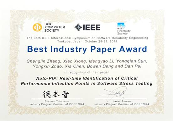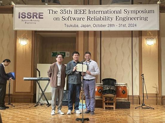 (张圣林 孙永谦)2024年10月28日至10月31日,第35届国际软件可靠性工程旗舰会议--IEEE International Symposium on Software Reliability Engineering(ISSRE'24,CCF推荐软件工程领域B类国际会议)在日本筑波市成功举办。公司304am永利集团张圣林老师和孙永谦老师参会,在会上报告了5篇录用论文的研究内容,并包揽该会议的两项最佳论文奖——最佳论文奖(Best Paper Award)和最佳工业论文奖(Best Industry Paper Award)。其中,张圣林老师、孙永谦老师与华为云计算公司、清华大学等单位合作的论文“Auto-PIP: Real-time Identification of Critical Performance Inflection Points in Software Stress Testing”荣获Best Industry Paper Award,该项工作受“CCF-华为胡杨林基金”资助。