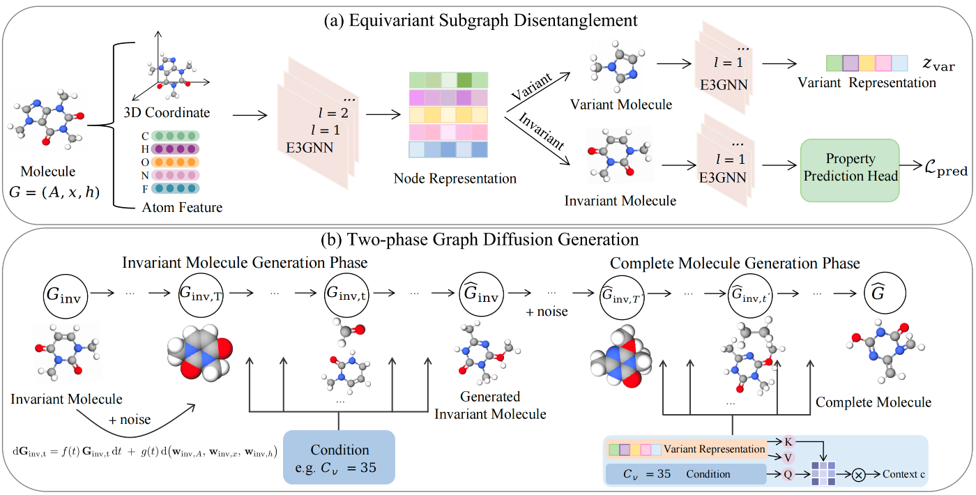 IC-MOL整体框架包含两个部分:等变子图解耦和两阶段图扩散生成。