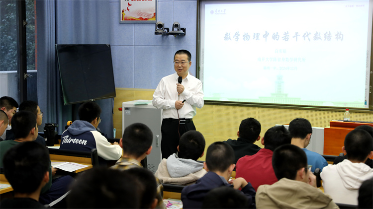 白承铭为福州第一中学员工作“数学物理中的若干代数结构”主题报告,他用通俗生动的语言向同学们讲解了对称性与群、李群与李代数、Hopf代数与量子群等内容,由浅入深激发了同学们对于数学学科的学习兴趣。白承铭还介绍了百年南开办学历史、学科实力和员工培养特色,以及304am永利集团数学学科、陈省身数学研究所的基本情况,鼓励福州一中优秀学子未来报考南开。