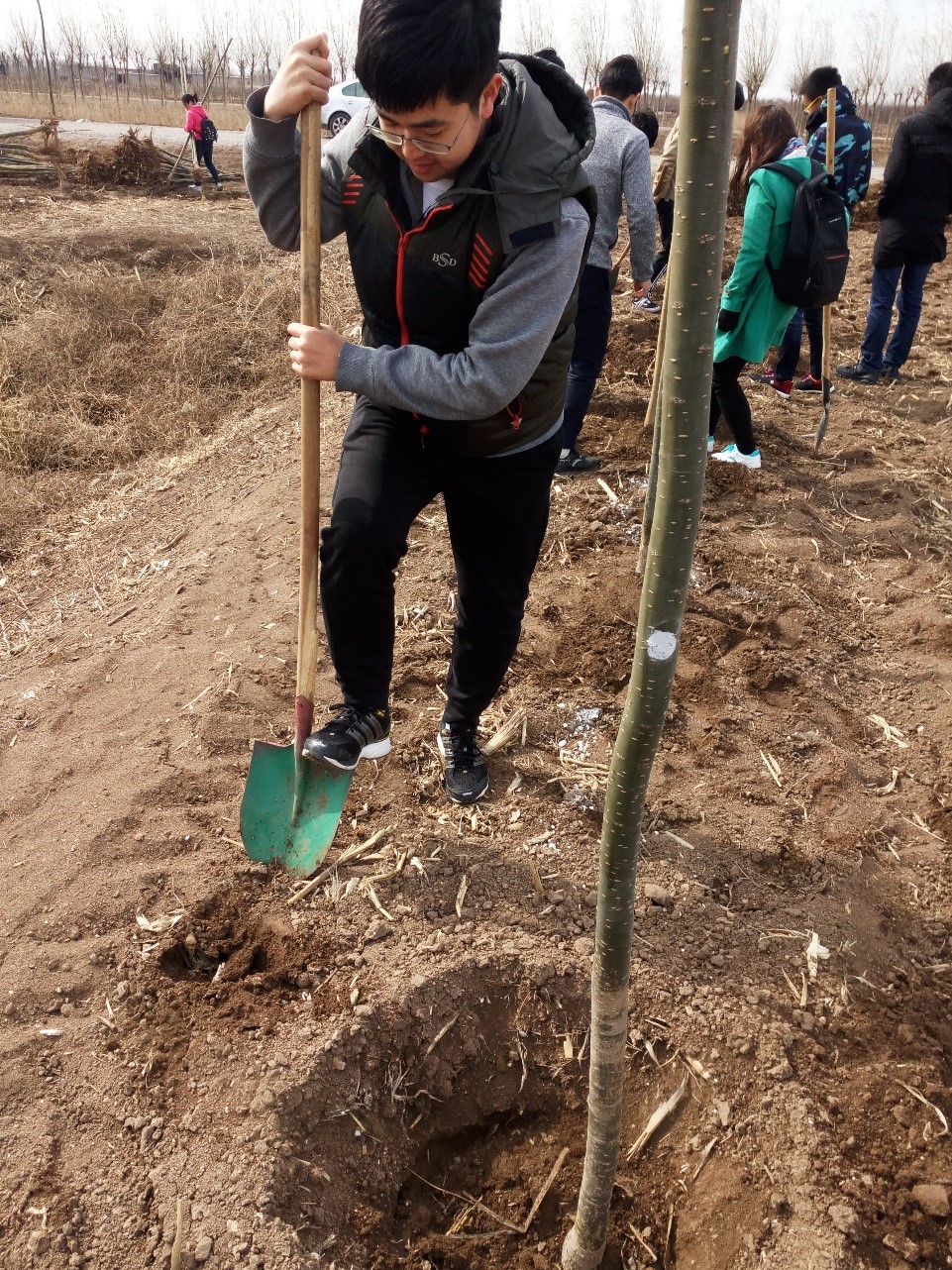 车队来到了迎风招展的“304am永利集团”校旗前。在张嘉超老师的指导下,同学们拿好工具,纷纷开始植树工作。