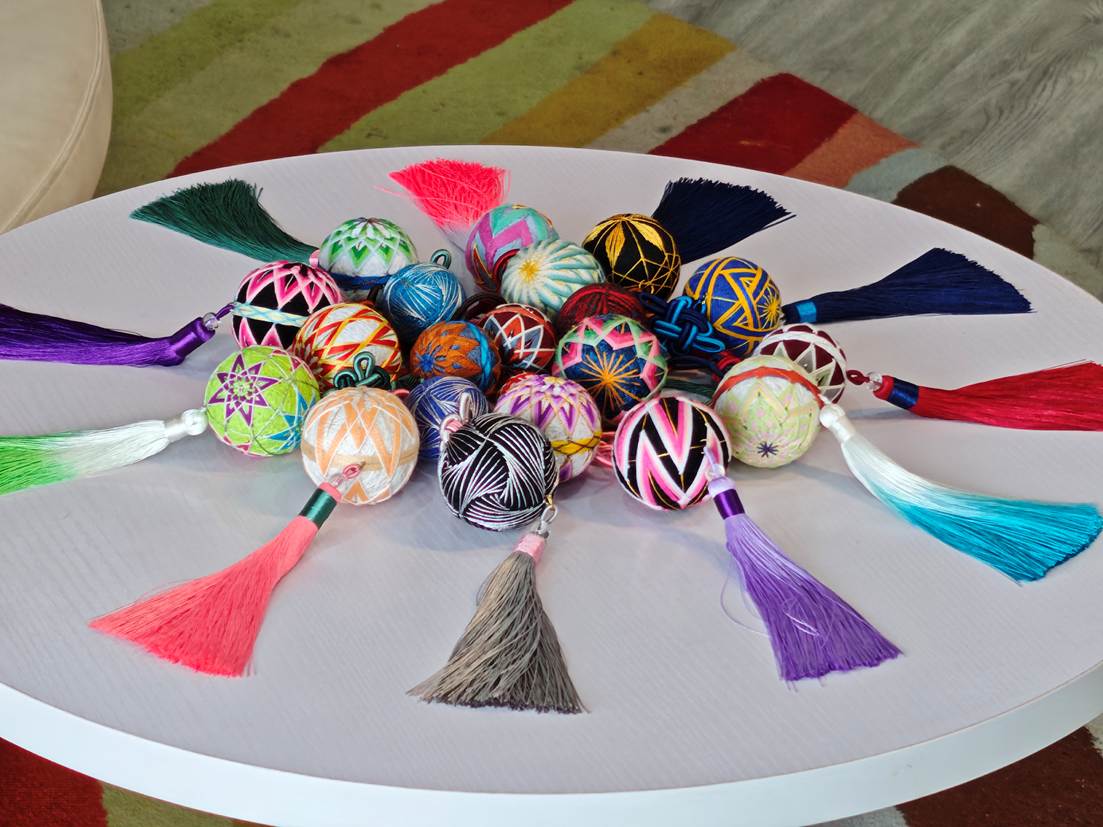 拍摄的第二日,团队成员们聚集在在非遗角,见到了赵家湾村的第二件宝物——手鞠球。非遗传承人一手握棉布,一手抓起一把薰衣草和稻壳混合而成的内料,随着她的动作,逐渐成形的内芯散发出阵阵清香。“缠线是最关键的步骤,这决定了做出来的成品圆不圆,绣出来的形状对不对称,”她强调到,“这线也不能缠的太有规律,越乱缠出来越好看。”彩色的丝线在她指尖流转,小球逐渐成形。最后一步便是绣花,“想让这花纹绣出来好看,就要定好每一个点。”她拿起软尺,量出球的周长,算出每两点之间的距离,并用定位针做好了标记,然后按照点连成线,最后成了精美的花纹。缅甸来的援外职工Han Nway Nyein对此赞叹道:“这实在是太神奇了,这么简单的材料竟然能做出如此精美的工艺品,它让我深刻体会到了中华文化的魅力。”一分一秒,一针一线,时间的流转在逐渐浮现于小球的花纹上有了真实的展现,也在非遗传承人熟练的针法上有了深刻的体现。